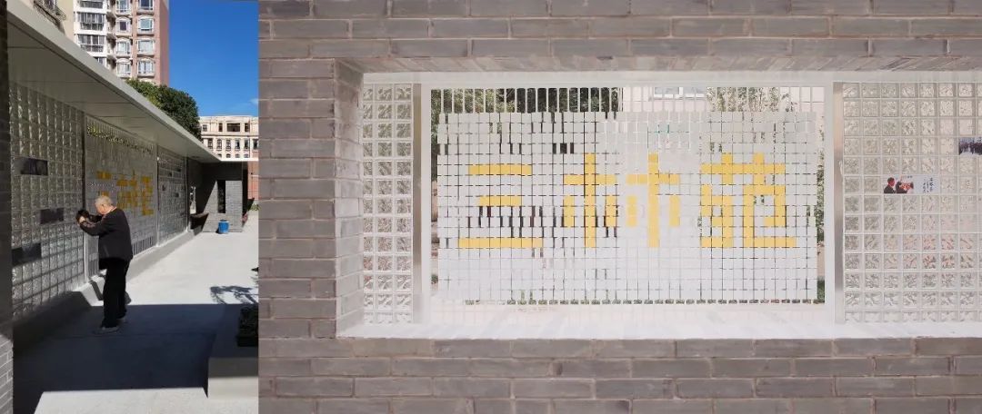 睦邻休憩区充分考虑了社区老人的需求,并继承延伸三林苑设计之初的“海派新一代”,用青砖墙结合玻璃砖和老照片来展现营造睦邻休憩的空间。