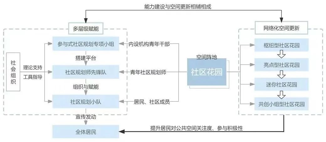 在社区公共空间和公共设施的改造过程中,参与式社区规划邀请规划、建筑、景观等专业力量,和居民、居委、驻区单位、社会组织等自治、共治力量,多方协同、民主协商、资源整合,共同推进项目设计与建设,以达成社区发展愿景。