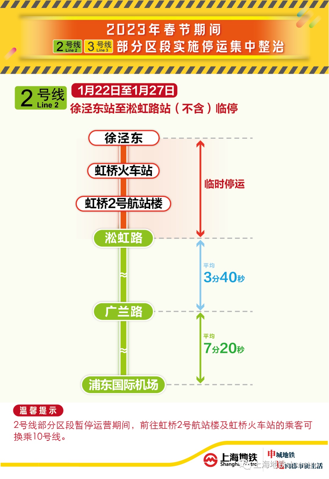 为充分利用春节客流低谷开展线路设施改造和安全整治,2023年1月22日至1月27日(年初一至初六),上海地铁2号线徐泾东站至虹桥2号航站楼站区段将临时停运施工,涉及的3座车站将临时封站,2号线全线将调整为“淞虹路站至广兰路站/淞虹路站至浦东国际机场站”大小交路运行。