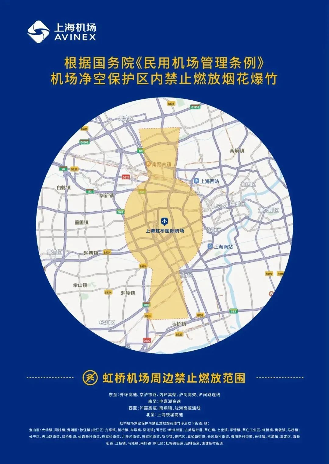 虹桥机场周边禁止燃放范围: