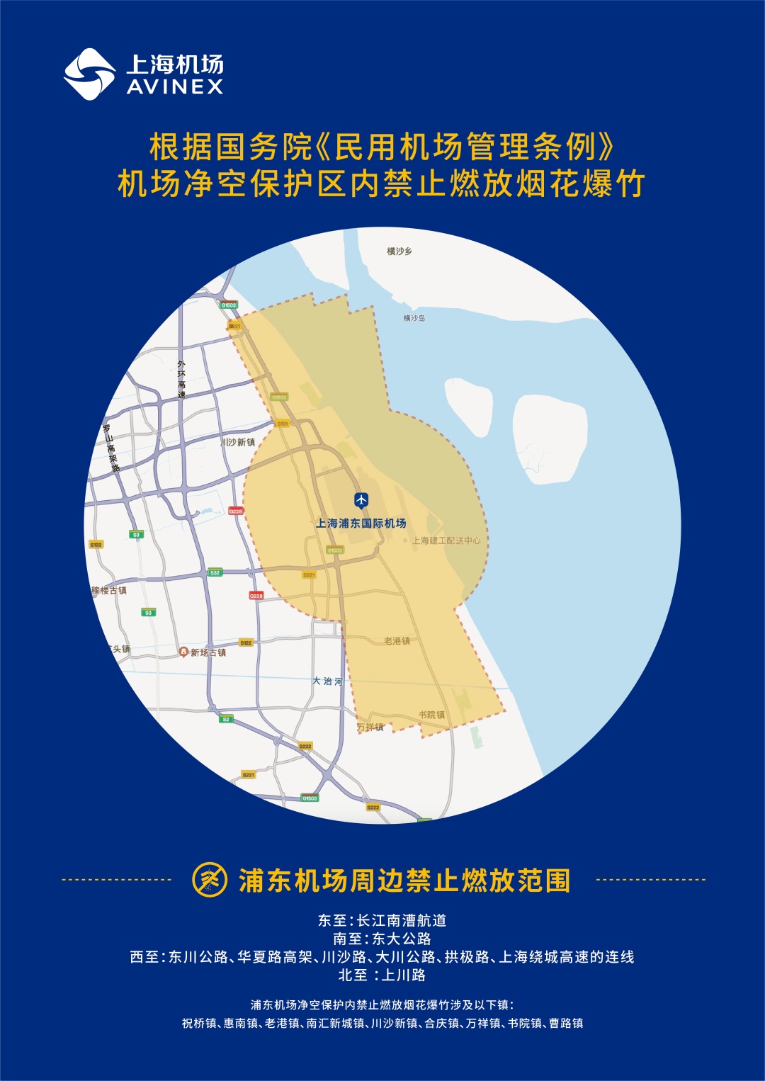 浦东机场周边禁止燃放范围: