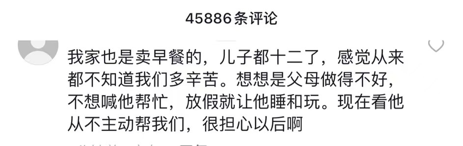 想想是我们没做好,不喊他帮忙,放假就让他睡和玩。现在看他从不主动帮忙,很担心以后!”