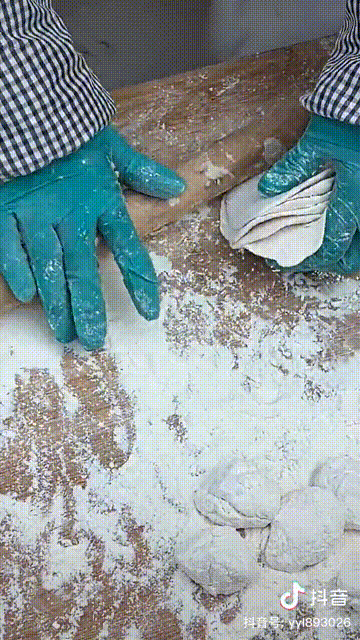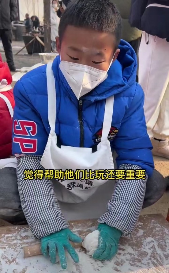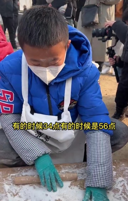 他戴着口罩,系着围裙,单看擀面皮的手法,跟“老师傅”一样娴熟。