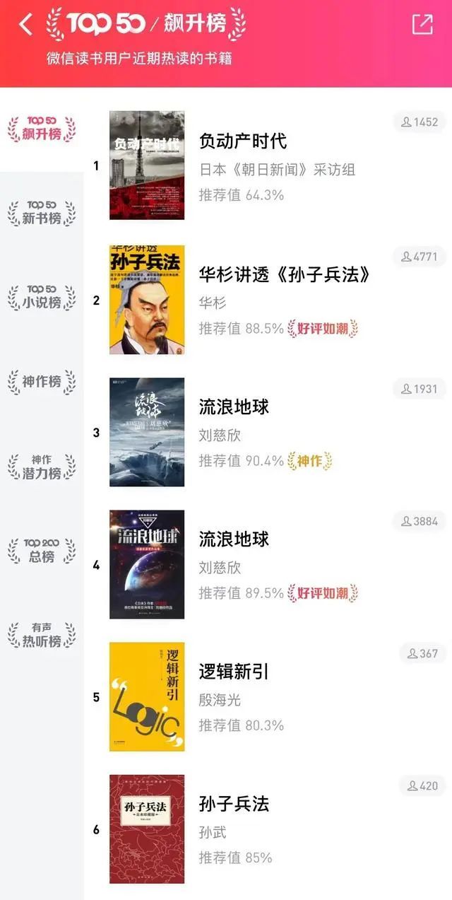 在微信读书平台,《孙子兵法》相关的讲解书籍也位列该平台飙升榜第一名。在TOP50飙升榜单前十中,《孙子兵法》相关书籍就占据两个位置。