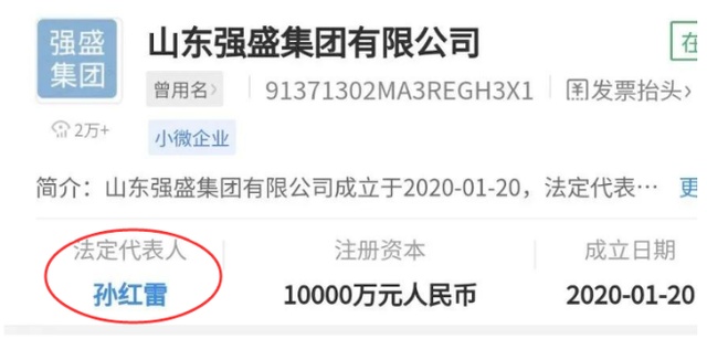 公开资料显示,山东强盛集团有限公司成立于2020年1月,曾用名为山东强盛房地产开发有限公司,大股东为孙红雷,持股99%。知识产权信息显示,目前,该公司已成功注册多枚“强盛集团”商标。
