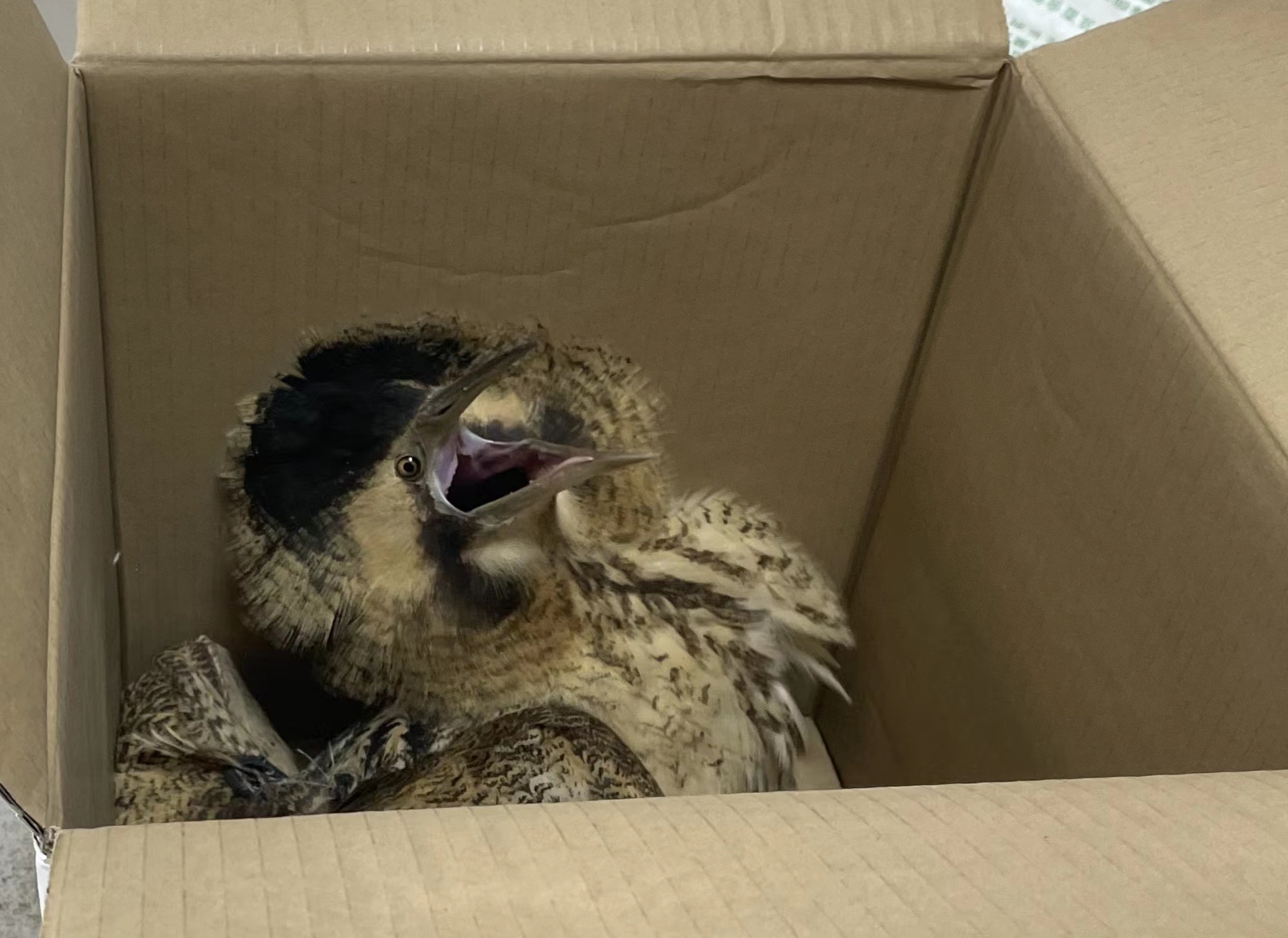 3月7日上午,崇明庙镇一热心市民报警求助,称在林地中发现一只大鸟蜷缩在地上,疑似受伤。庙镇派出所民警迅速赶到,该鸟见有人接近,鸟喙不停向上啄,民警小心翼翼地把大鸟装进纸盒,带回派出所。