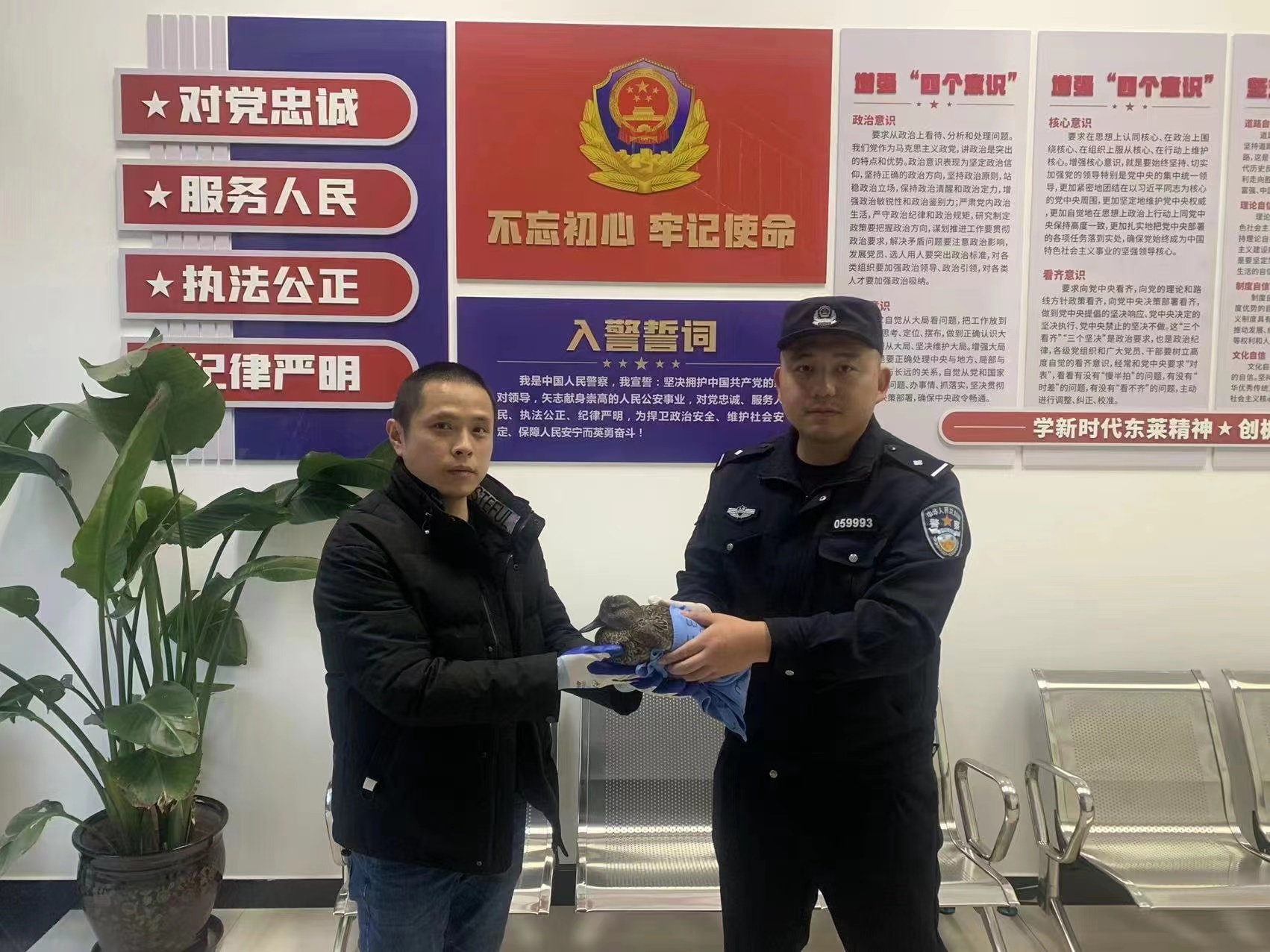无独有偶,3月8日,陈家镇派出所接热心市民报警,称在中华鲟保护区西大堤上有一只野鸭子疑似受伤,请求民警救助。