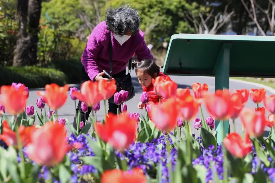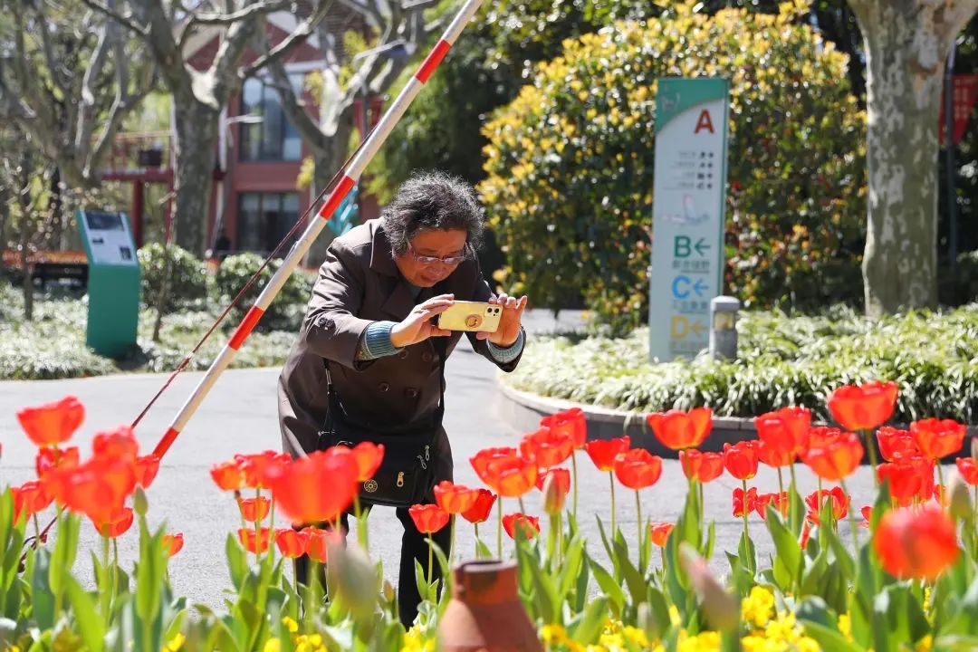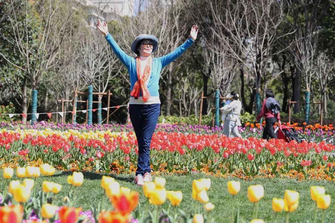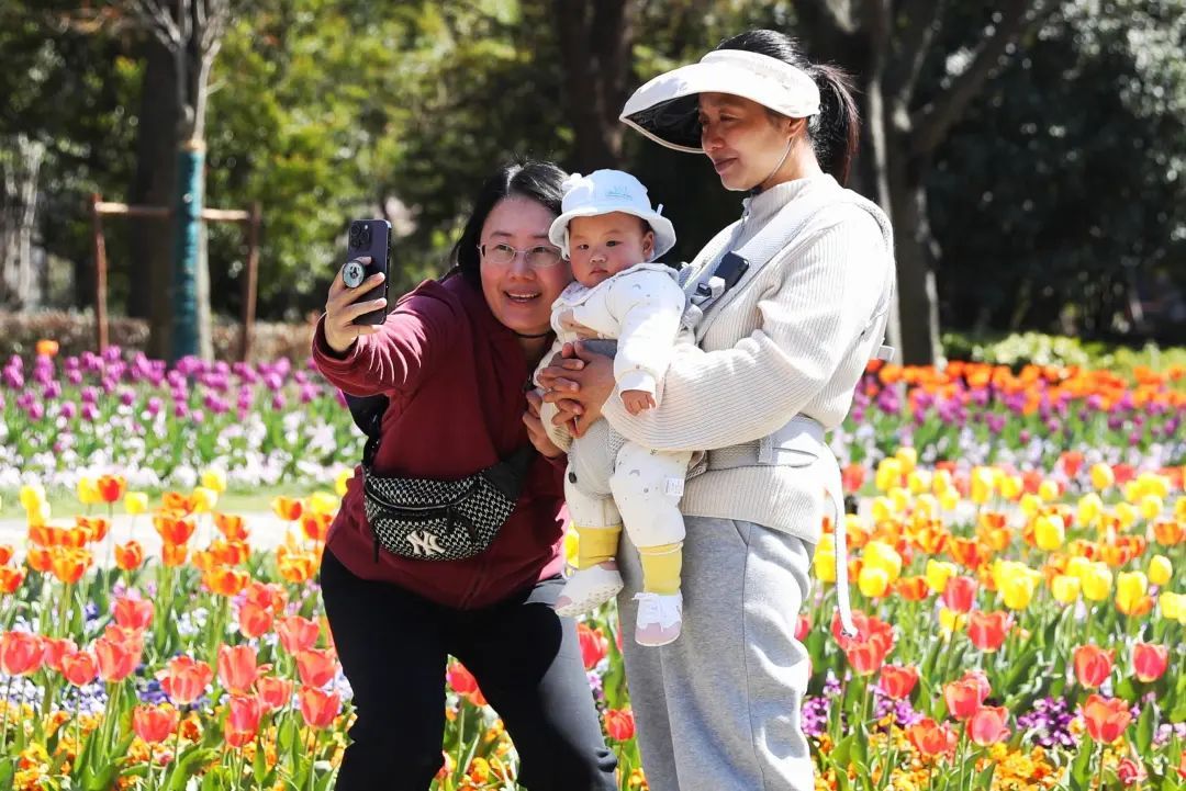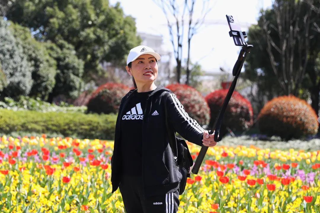 抱着孩子自拍的女士、戴着围巾摆出Pose的阿姨、举着自拍杆对着花坛直播的姐姐,她们一个个在花丛中笑得很甜。