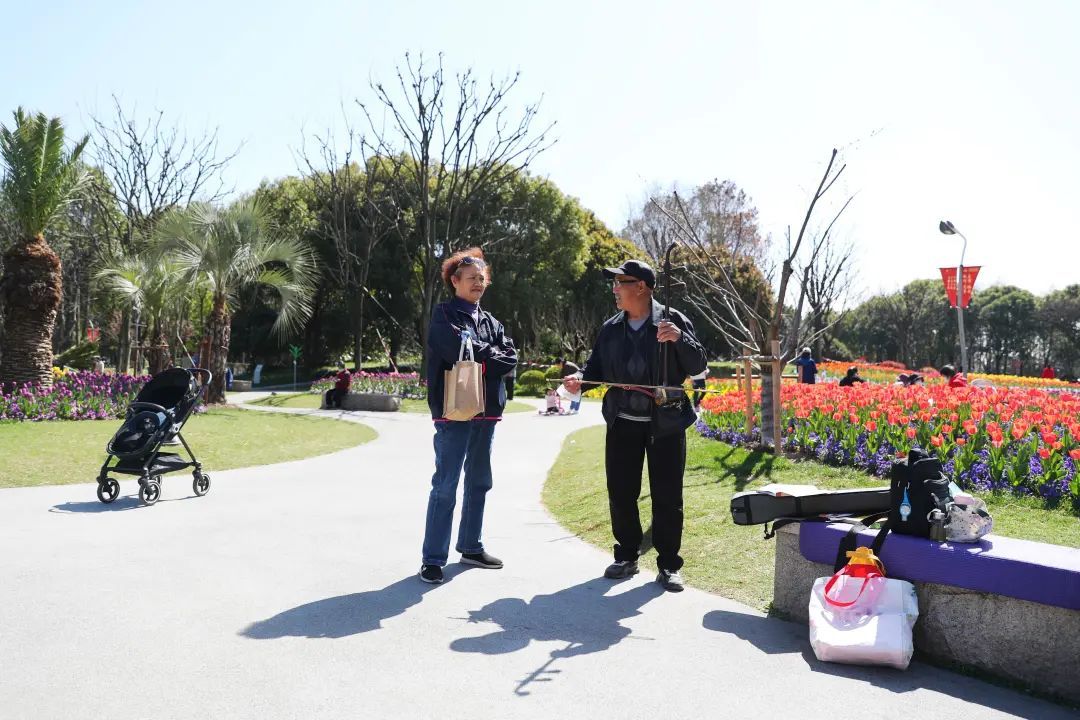 拉二胡的老伯正和朋友畅聊着生活,悠扬的乐章与花香完美地交融在一起。
