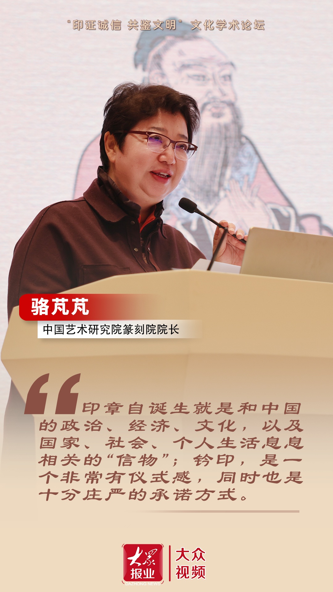 3月20日,首届中华印信文化精品展在孔子故里山东曲阜的孔子博物馆开幕。3月21日,该展览的配套论坛“印证诚信共鉴文明”文化学术论坛、全国印社座谈会在曲阜的孔子讲堂举行。本次论坛是全国级印信文化学术交流的深度平台。中国艺术研究院篆刻院院长骆芃芃在接受大众日报记者采访时表示,印章自诞生就是和中国的政治、经济、文化,以及国家、社会、个人生活息息相关的“信物”;钤印,是一个非常有仪式感,同时也是十分庄严的承诺方式。