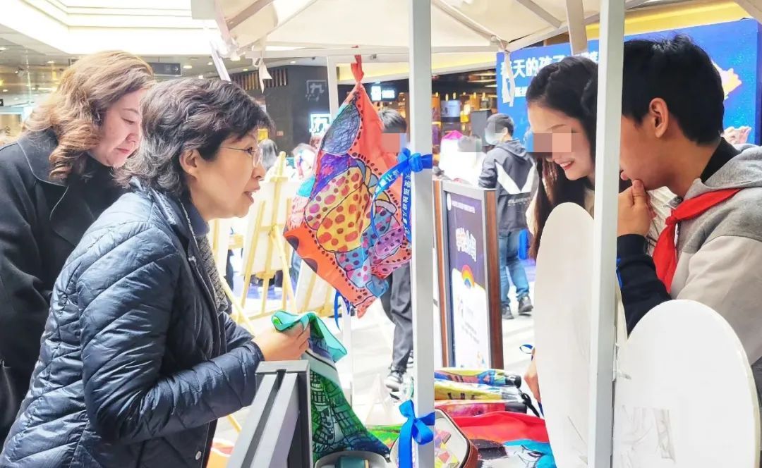 除了融合绘画,活动还设置了义卖环节,学校将同学们这些别具一格、充满想象力的艺术作品制作成了环保袋、杯垫、伞、丝巾等,每一个都是独一无二的存在。老师和孩子们化身“小老板”卖力吆喝,招揽着往来的路人们。