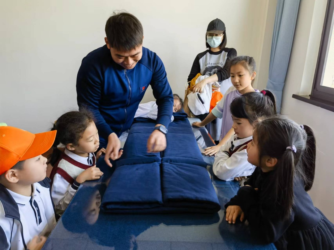 随后,消防员带领孩子们实地参观了各种消防车,为他们讲解各种救援车辆的名称、功能以及车内各类救援器材的用途。孩子们还跟随消防员参观了他们的宿舍,学习叠被子等技能。