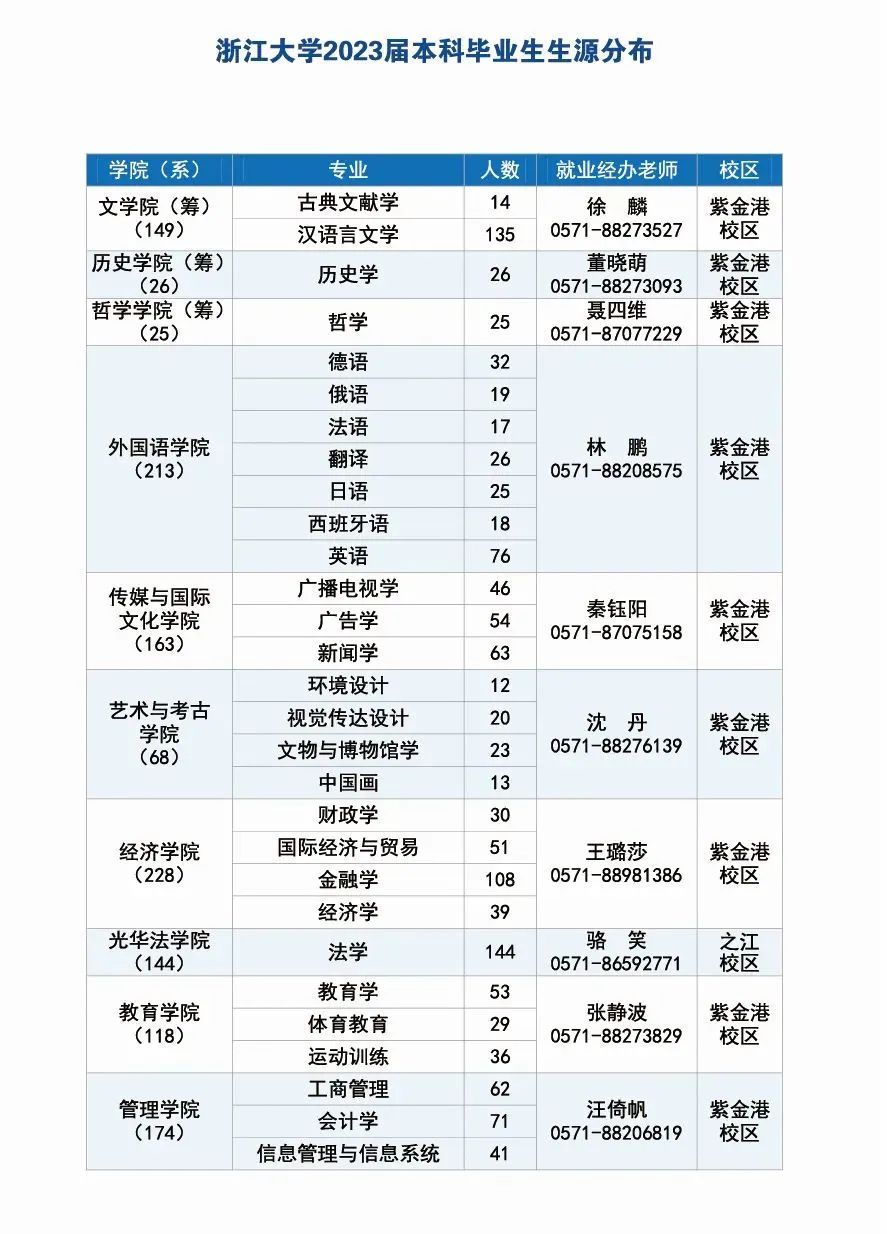 浙江大学2023届毕业本科生、硕士生、博士生共约15000人,学科涵盖哲学、经济学、法学、教育学、文学、历史学、艺术学、理学、工学、农学、医学、管理学等12个门类。