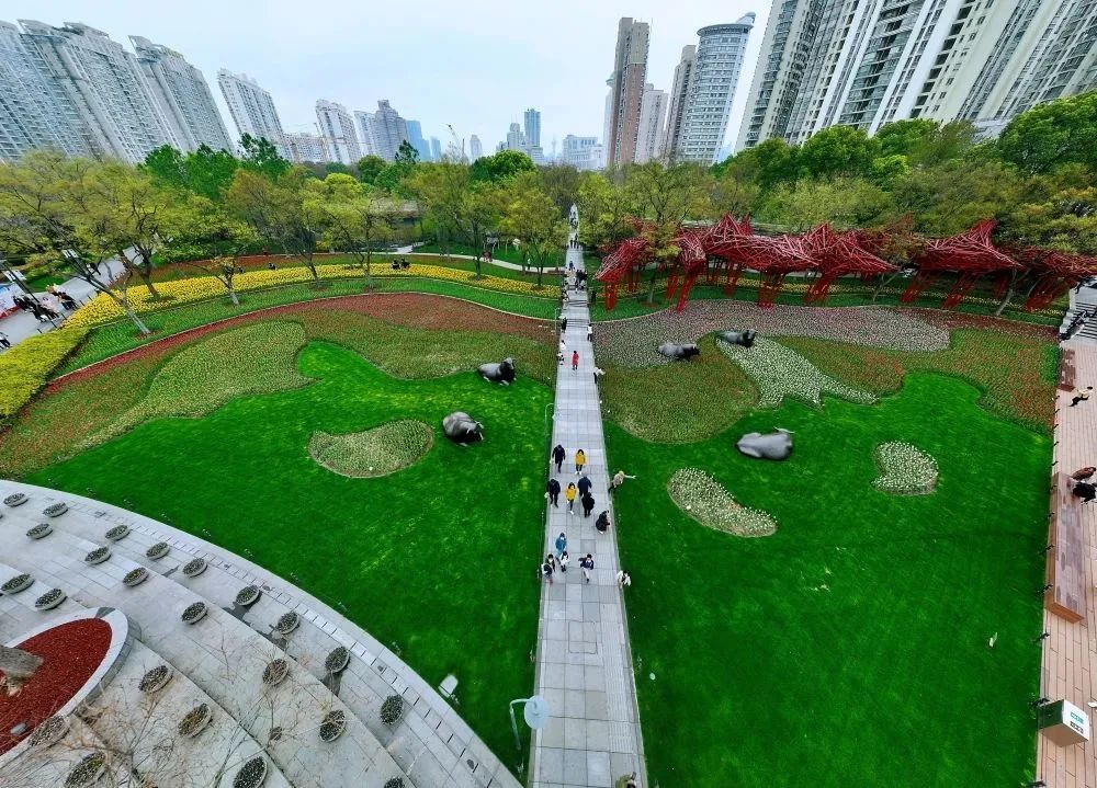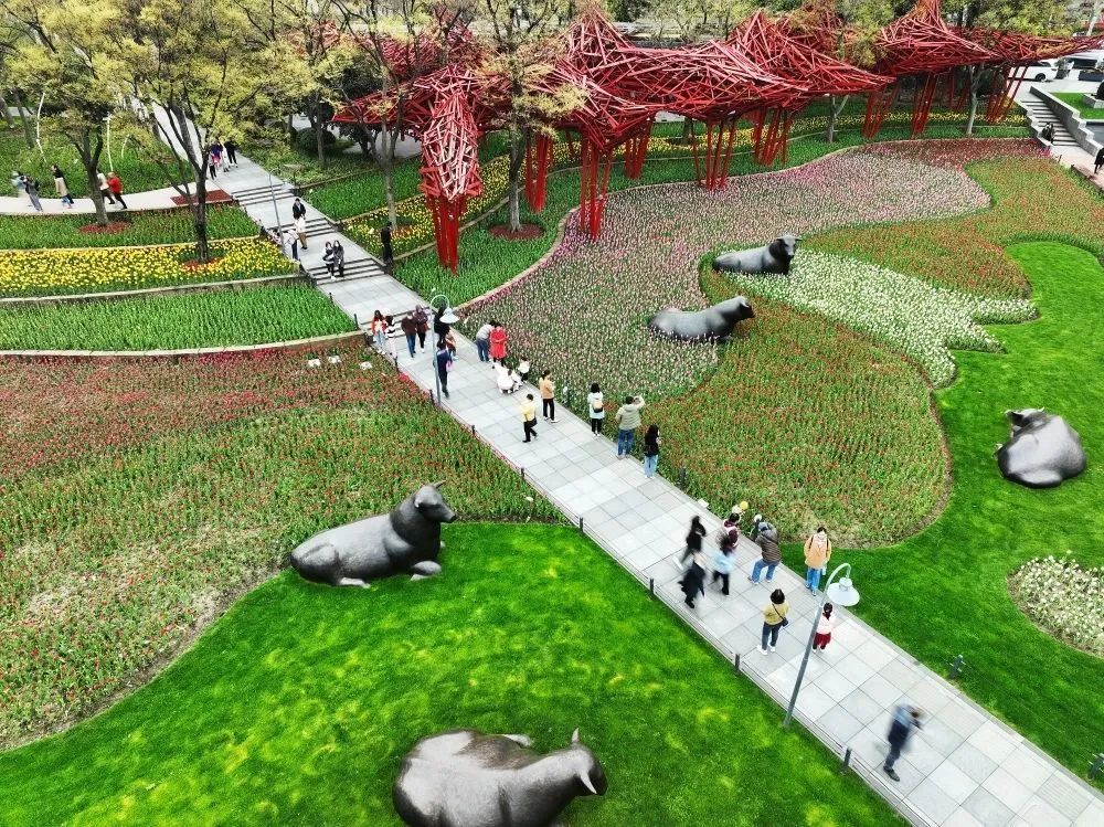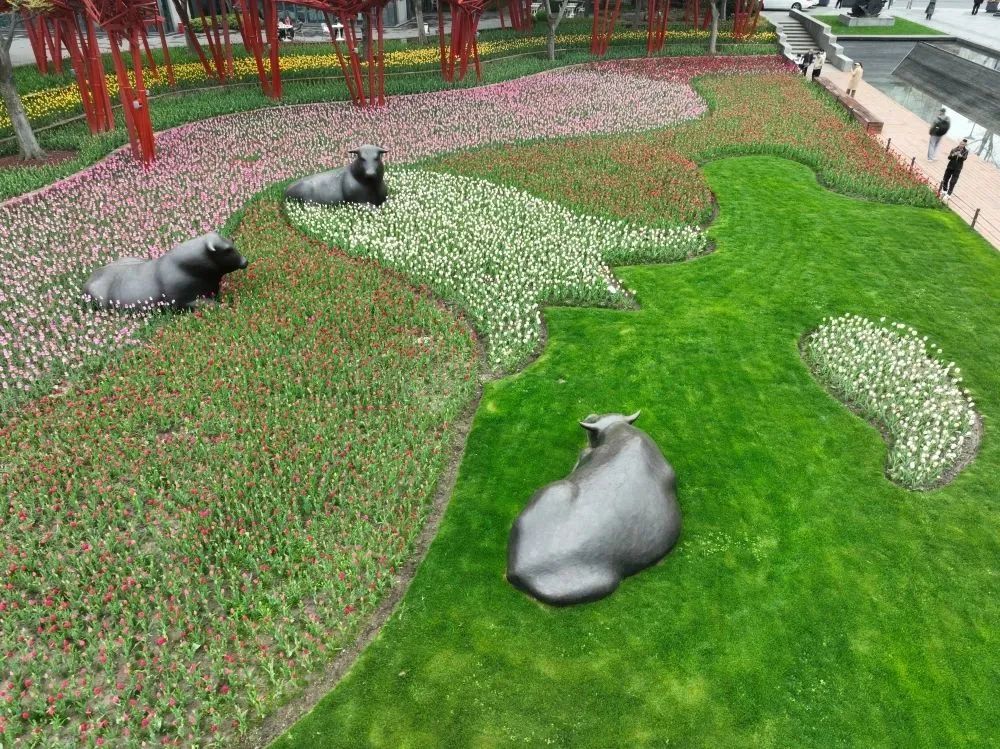 作为2023静安·新湖郁金香花博会的重要点位,这里可以感受郁金香花海与不同意趣的雕塑作品相映成趣、互相烘托的难得春景。