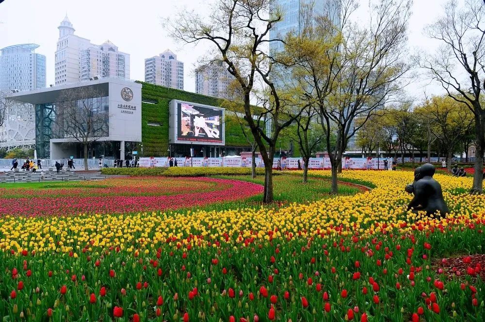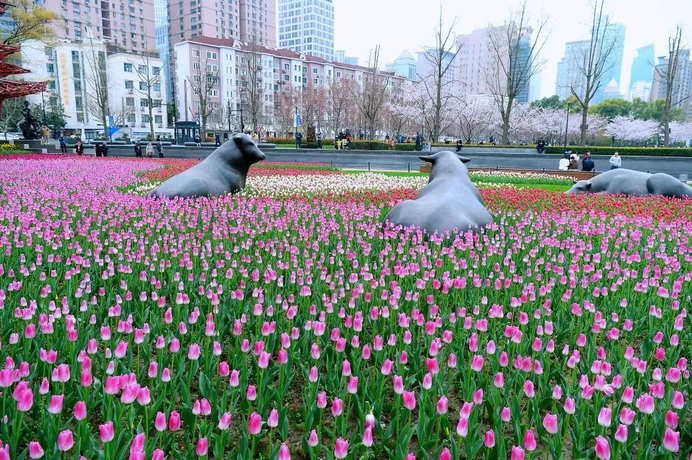 静安雕塑公园里盛开的郁金香,一株株艳丽多姿、一簇簇亭亭玉立,让拂过它的春风也染上了斑斓的色彩。
