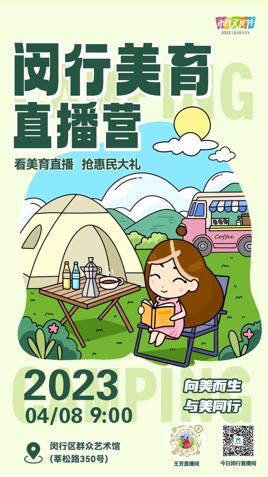 4月8日上午9点,以露营风的形式推出闵行美育直播营,闵行文旅及美育资源推介,各街镇及工业区文化氛围营造及文创产品展售,内蒙赤峰、山东临沂、安徽淮南、云南昭通四地文旅及好物推介将同期呈现,着力呈现社会各界齐参与、千万市民共分享的活动现场。
