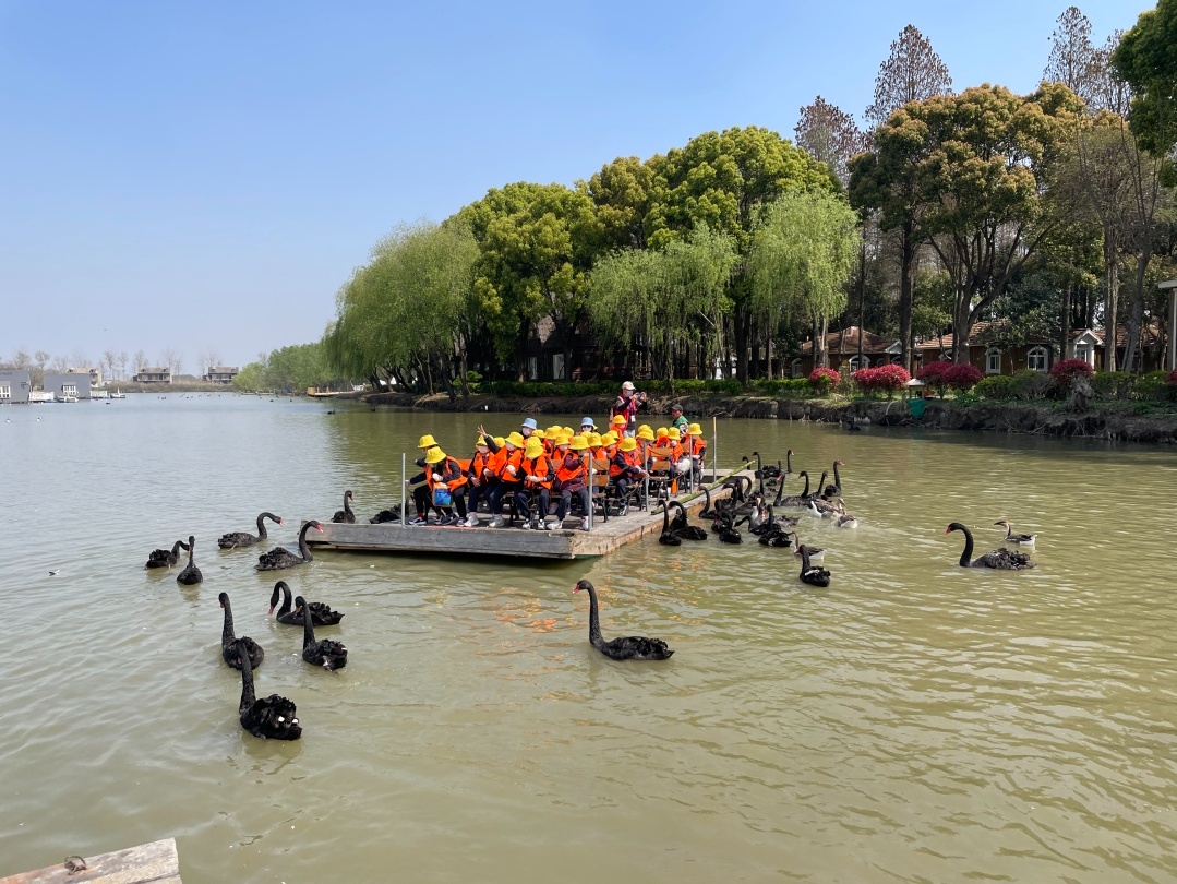 淀山湖黄金水道漕港河及其支汊环绕着庄园,优美的湿地生态环境让黑天鹅等鸟类安心地成为了这里的“主人”,也成为很多市民近距离接触鸟类、解锁鸟类知识的理想之地。不少春游踏青的小朋友乘着竹筏,在湖心投喂黑天鹅,并观察它们的美丽姿态以及互动的样子。大千天鹅湖庄园良好的生态资源优势和鸟类生态系统,为科普鸟类知识提供了有利的条件,庄园专门开设了观鸟、爱鸟、护鸟课程,科普宣传鸟类知识。“我们正在打造自然教育基地和劳动教育基地,设置了很多的课程,可以让小朋友直观地了解自然环境、爱惜自然、保护自然。”杨航说。