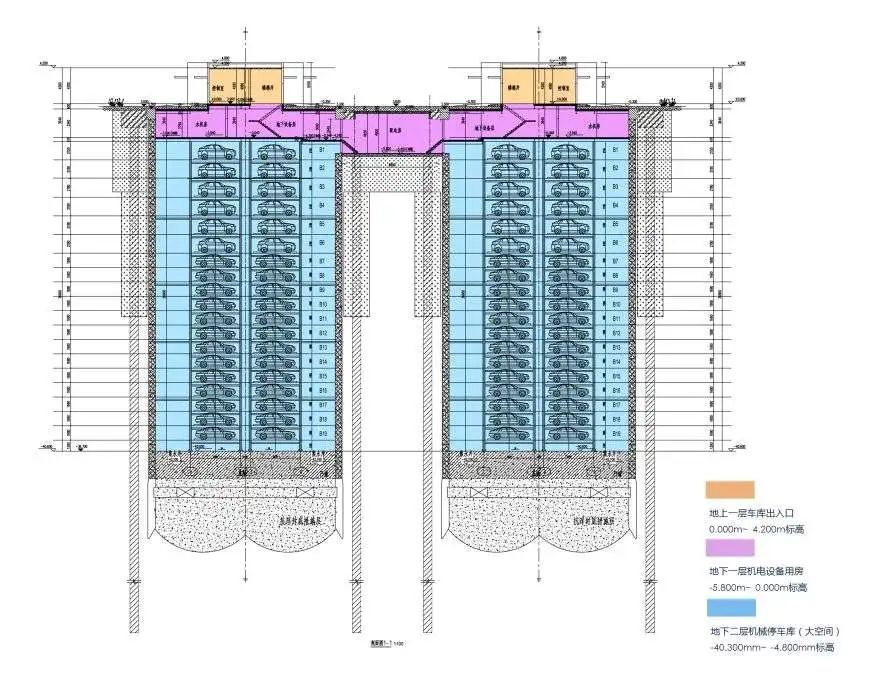 项目地上占地面积286平方米,地下占地面积836平方米,深度约50米,共19层,可停放车辆304辆,是同等面积地上停车场停放车辆的10倍。