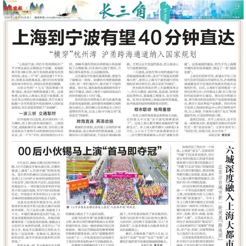 【智库声音】新民晚报 | 何建华等:上海到宁波有望40分钟直达 “横穿”杭州湾沪甬跨海通道纳入国家规划