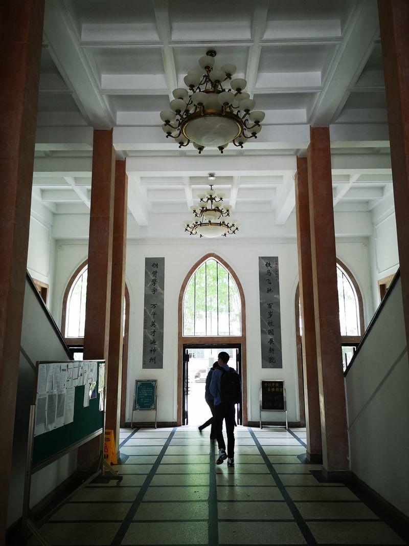 师生们行至工程馆建筑门口,刘统又戴着耳麦做起了“导览”。这座竖立着无线电报发明人马可尼纪念柱的工程馆,如今是交大学子最常去的自修大教室,当年却正是华东局机关进驻上海第一天的驻址。