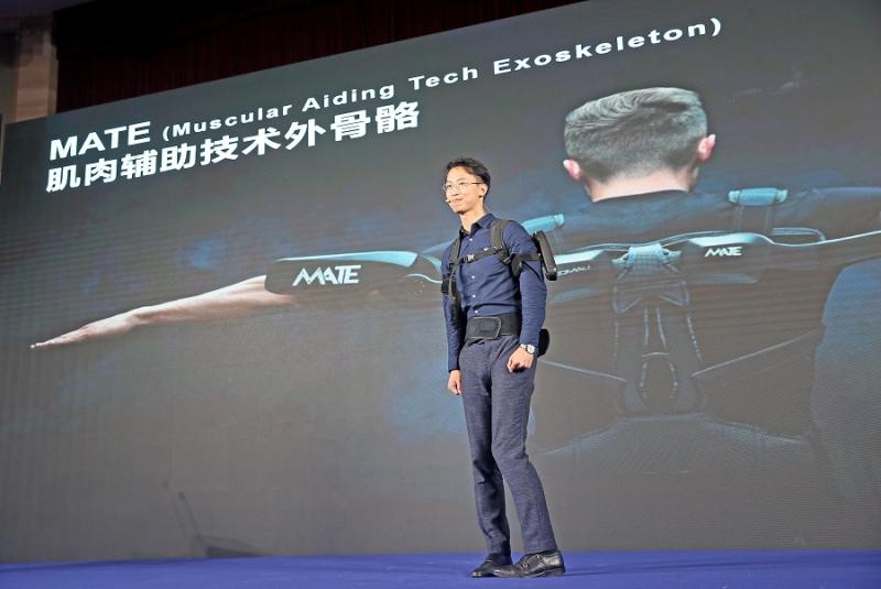 和其他发布人身穿西装、衬衫等常规服装登台不同,柯马机器人的相关负责人肖骄穿着一套黑色“铠甲”出现时,台下观众瞬间投来好奇的目光。这一“神奇服饰”正是柯马“首款可穿戴肌肉辅助外骨骼MATE”。