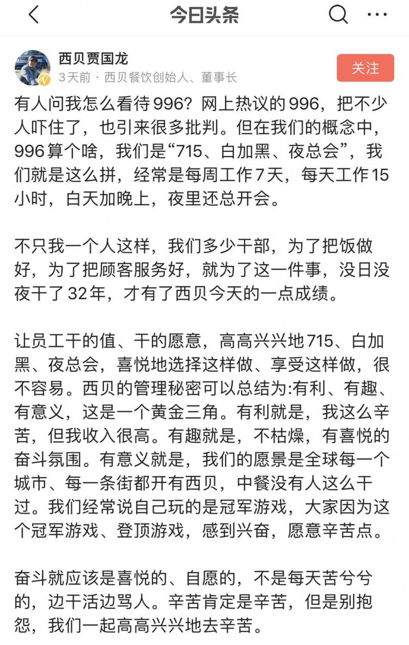 9月4日晚上,西贝董事长贾国龙在社交账号上发了一条有关企业内部工作制度的内容,他说:“996算个啥,我们是‘715、白加黑、夜总会’,我们就是这么拼,经常是每周工作7天,每天工作15小时,白天加晚上,夜里还总开会。”他表示,不只其一个人这样,西贝多少干部没日没夜干了32年,オ有了西贝今天的一点成绩。