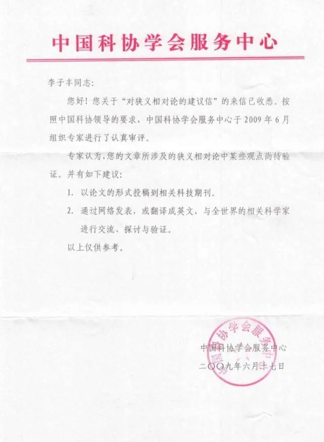 但在2009年,中国科协学会服务中心就回应过“李子丰对狭义相对论的建议信”,委婉地表达了“观点尚待验证”。