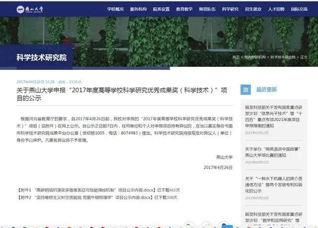 而在燕山大学官网可以看到,该研究项目曾获燕山大学推荐,申报教育部2017年度高等学校科学研究优秀成果奖(科学技术),但最终未能获得教育部前述奖项。