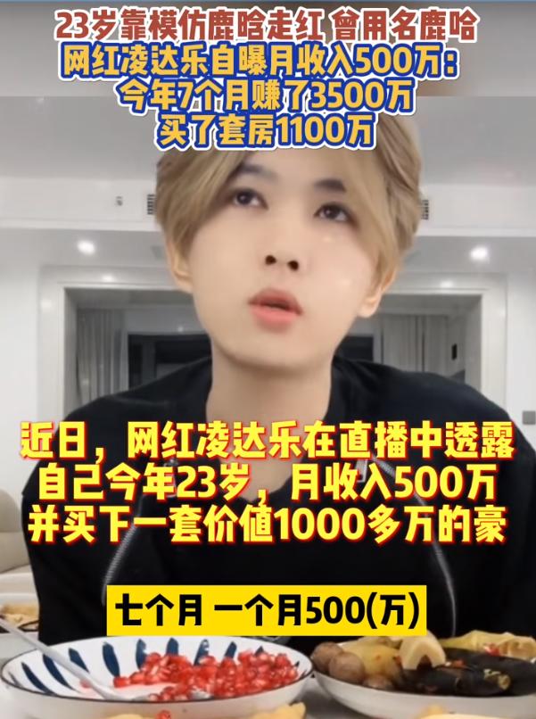 近日,网红凌达乐(鹿哈)直播时自曝“月赚500万,带货7个月挣了3500万”引发大量网友热议。