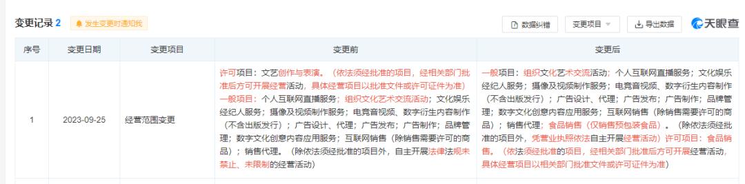 天眼查App显示,今年2月,长沙凌达乐文化传媒有限公司成立,法定代表人、执行董事、经理为凌达乐,注册资本100万人民币,经营范围含组织文化艺术交流活动、个人互联网直播服务、文化娱乐经纪人服务、互联网销售等,由凌达乐全资持股。变更记录显示,近日,该公司经营范围已去除文艺创作与表演,同时新增食品销售。