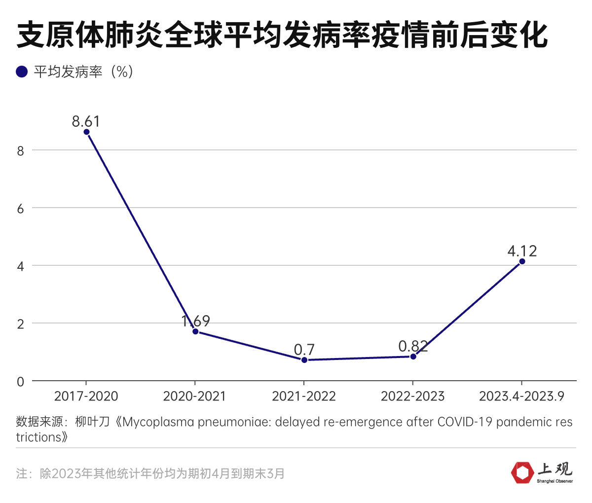 而根据《柳叶刀》期刊的论文数据,截至今年9月,支原体肺炎的发病率水平并未达到新冠肺炎疫情前的数字。疫情前,支原体肺炎的全球平均发病率达到8.61%,2020-2021年、2021-2022年分别下降至1.69%、0.7%,2022-2023年也仅有0.82%,今年4-9月的全球平均发病率则约为4.12%。