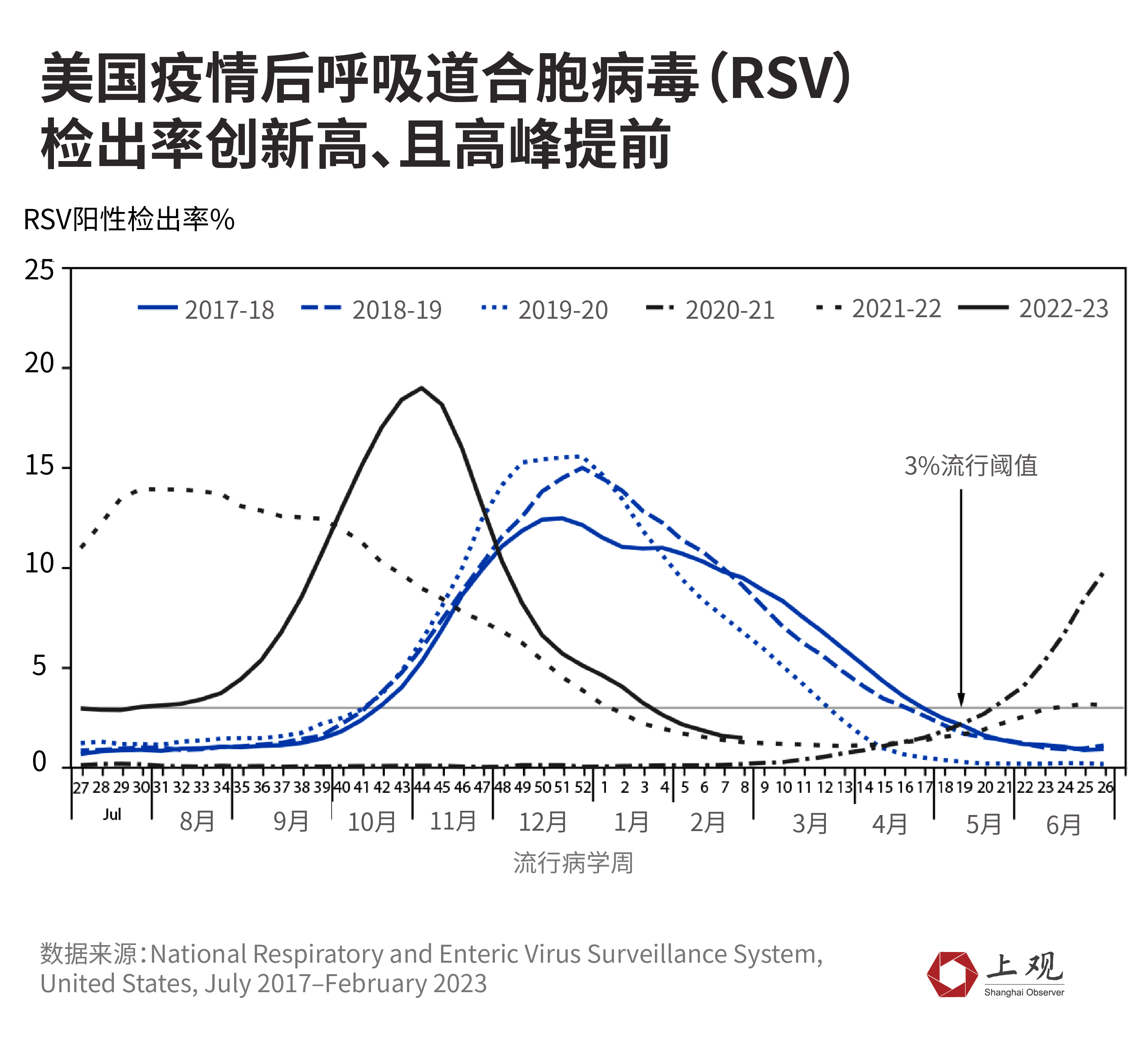 但随着美国放宽管控,2021-22流行季提前于 5 月开始,7 月达到顶峰,1 月结束。2022-23流行季的开始时间和高峰期则分别为6月、11月,晚于 2021-22 流行季,但早于大流行前的季节。同时,这一流行季的PCR测试阳性检出率为近年来最高,接近20%。