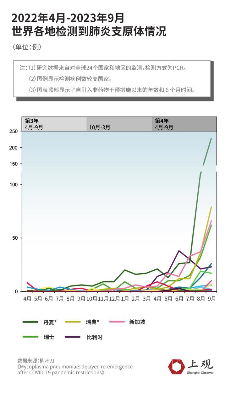 从各国公布的数据趋势来看,支原体肺炎感染基本从夏季开始有所增加,并非突然爆发,《柳叶刀》发布于11月23日的一则研究,监测了全球24 个国家今年4-9月的支原体肺炎感染数据。数据显示,今年以来,丹麦、瑞典、新加坡、瑞士等地的支原体肺炎感染病例均从8月开始出现快速上升。