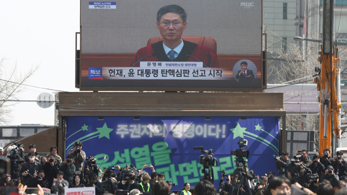 2025年4月4日,民众在韩国首都首尔的韩国宪法法院附近观看尹锡悦弹劾案宣判过程的电视直播。