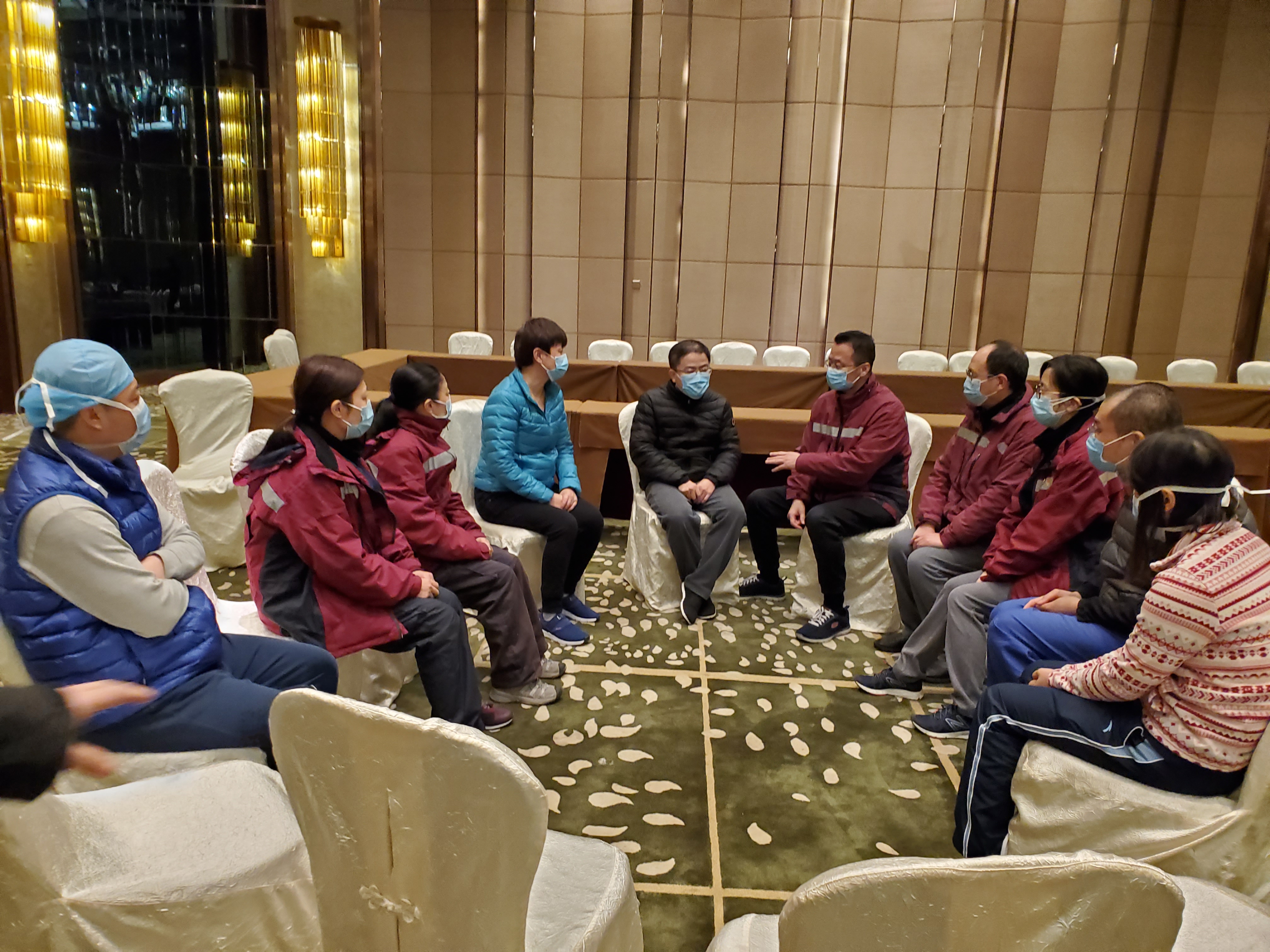 刚开始最大的问题是焦虑。队员在宾馆里是一个人一个房间,生活上没有什么机会去聊天,吃饭也是领着盒饭回到房间。在工作岗位上谈的都是工作,匆匆忙忙的,而且有限的话都说在病人的治疗上。没有人沟通,如果内心不够强大,很容易出现精神上的一些不适。我和护士长、各组组长说过,定期开开小会,大家定期坐一坐、谈一谈心里的困惑。另外我站在这个地方陪在旁边,他们心里会有一种安定感。
