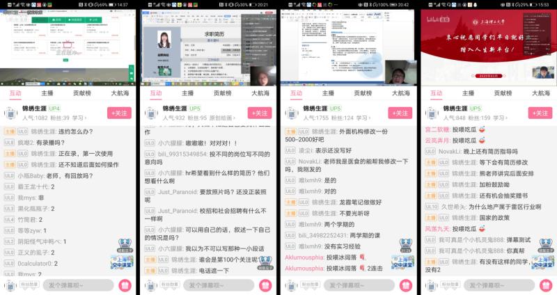 从今年3月起,上海理工大学学生就业指导中心开出了“就业政策咨询”直播。一开播,直播室就很快涌进了1000余学生,硕士生、本科生,落户问题、签约问题、就业权益……师生们纷纷互动,计划1个小时的直播,延长了半小时。随后,中英学院张卫老师、医食学院郭红保老师、基础学院熊冕老师也纷纷上线,成为就业“主播”,吸引了累计近4000人听课,每次直播都因为同学们的热情参与而增加时长。此外,学生就业指导中心还邀请了杨浦区启航导师周敏、王一婷两位企业导师上线直播“职场适应与生涯成长”“职场形象与妆容”课,时长2个小时的活动吸引了700余人次参与。学校的直播平台更是开出了“模拟面试”,由已经找到工作的学生当面试官,未找到工作的同学当求职者,体验面试中可能会碰到的各种情况。